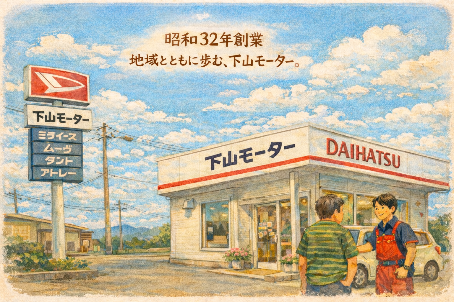 福島県伊達市の下山モーターは、お客様の安心・ 安全・快適にお車をお使いいただくため新車・中古車の販売と整備を行っています。