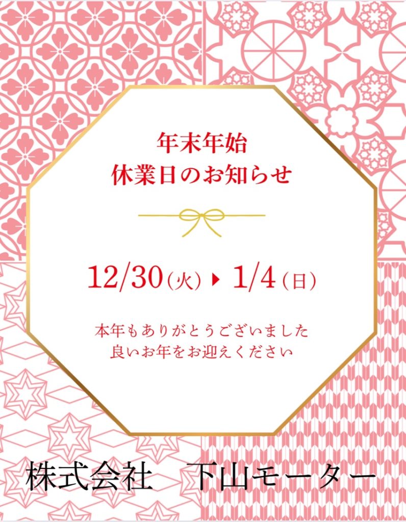 年末年始休業のお知らせ 2025年12月26日 最終更新日時 : 2025年12月28日 pcsapuri いつも下山モーターをご利用いただき、ありがとうございます。 誠に勝手ながら、年末年始は下記の期間を休業とさせていただきます。 🗓 休業期間12月30日 ~ 1月4日 1月5日(月)より通常営業いたします。 休業期間中にいただいたお問い合わせにつきましては、営業再開後、順次ご対応いたします。ご不便をおかけいたしますが、何卒ご理解のほどよろしくお願いいたします。 来年も下山モーターをどうぞよろしくお願いいたします✨ Follow me!